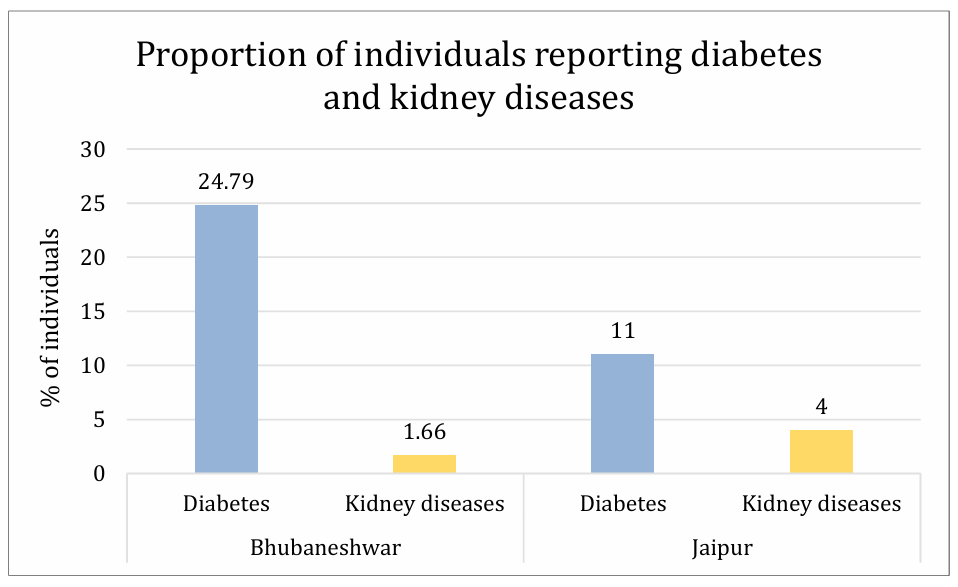 The use of ORS is highly discouraged for people with kidney disorders and those on a fluid-restricted diet. Kidney disorders impair the body’s ability to regulate electrolytes and fluids, so unregulated intake of ORS can increase pressure on the kidneys, which may struggle to manage the extra fluids and electrolyte load (especially sodium and potassium). For patients with chronic diseases such as diabetes, hypertension or heart disease, who are advised to regulate their salt and sugar intake, ORS consumption should be done cautiously. Excessive intake may lead to electrolyte toxicity and disturb the blood sugar or sodium levels in the body. Chronic diseases like diabetes further leads to the development of kidney-related complications. This increased susceptibility also raises concerns regarding the unregulated use of ORS. The Centre for Disease Control and Prevention (CDC) data indicates that approximately 1 in 3 adults with diabetes may develop chronic kidney disease (CKD). The ICMR-INDIAB study (2023) also reported that 40% of people with type 2 diabetes and 30% of those with type 1 diabetes develop kidney diseases. Moreover, death dues to renal failure have been increasing in India, with diabetes being a major contributor3. The primary survey conducted under the CHHANW project in Bhubaneswar, Odisha and Jaipur, Rajasthan reported a substantial proportion of individuals with chronic disease (Diabetes) and kidney diseases, necessitating greater caution in suggesting ORS as a feasible intervention.